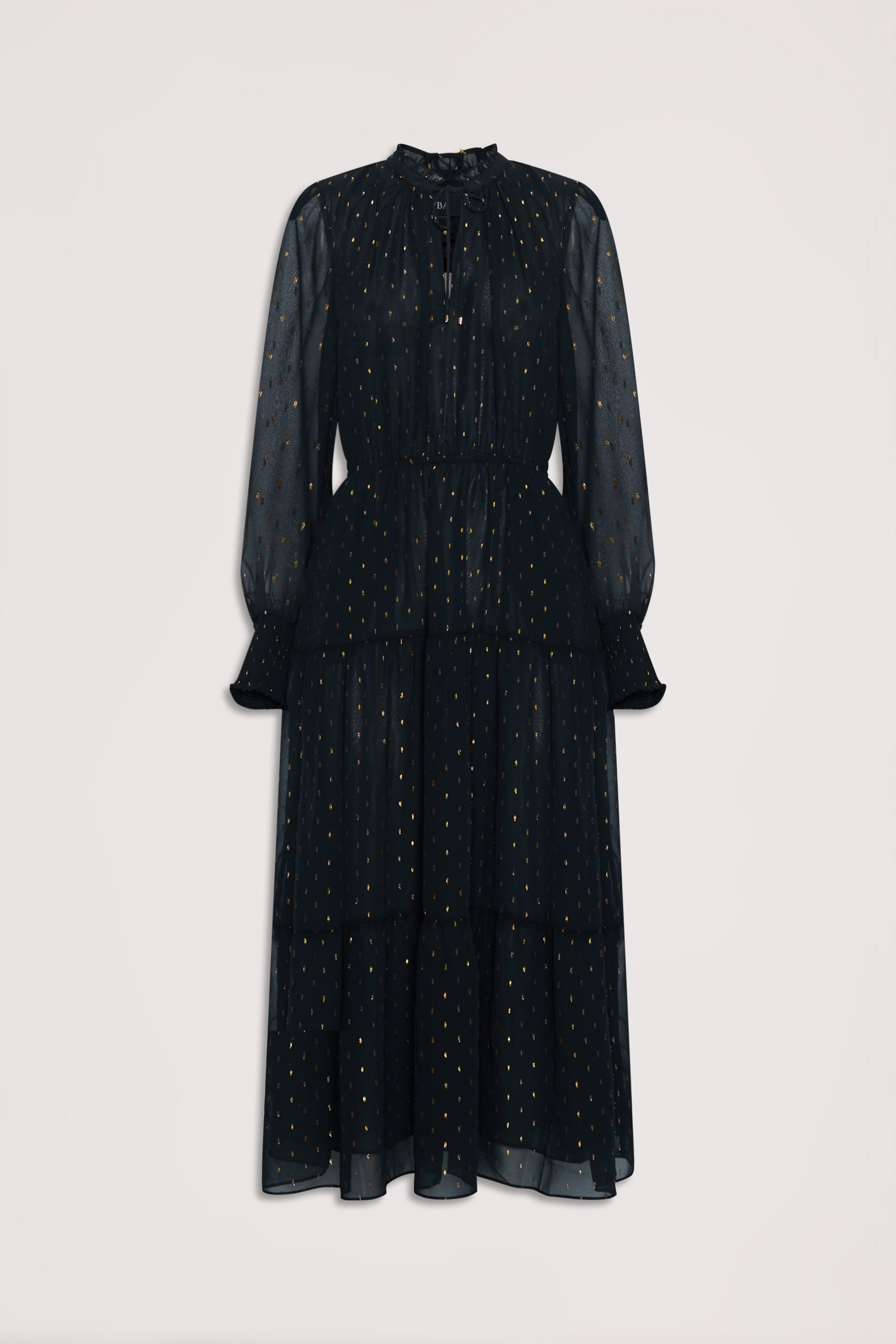- Raised neckline with frill