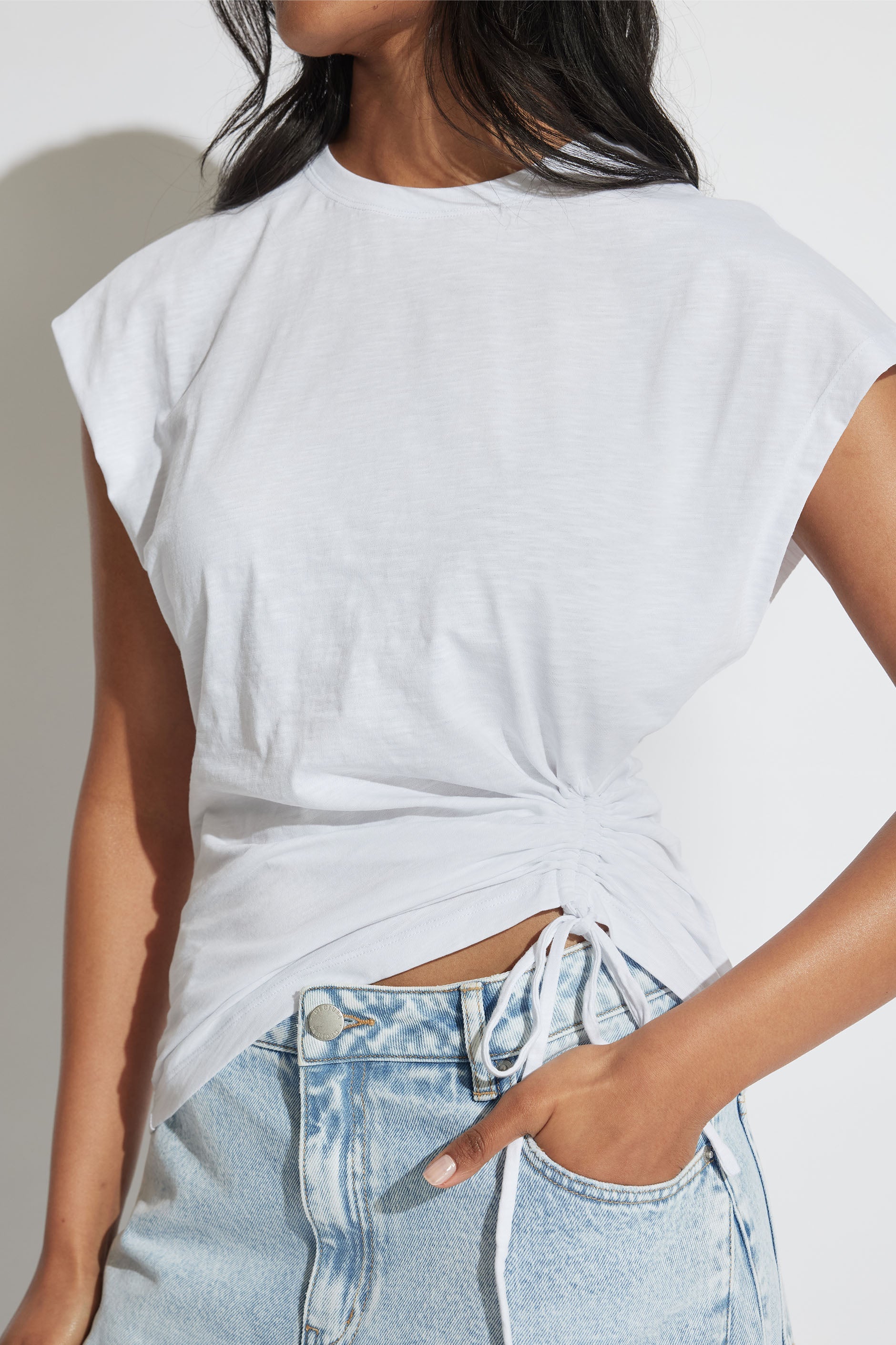 - Ruched side detail with adjustable tie
