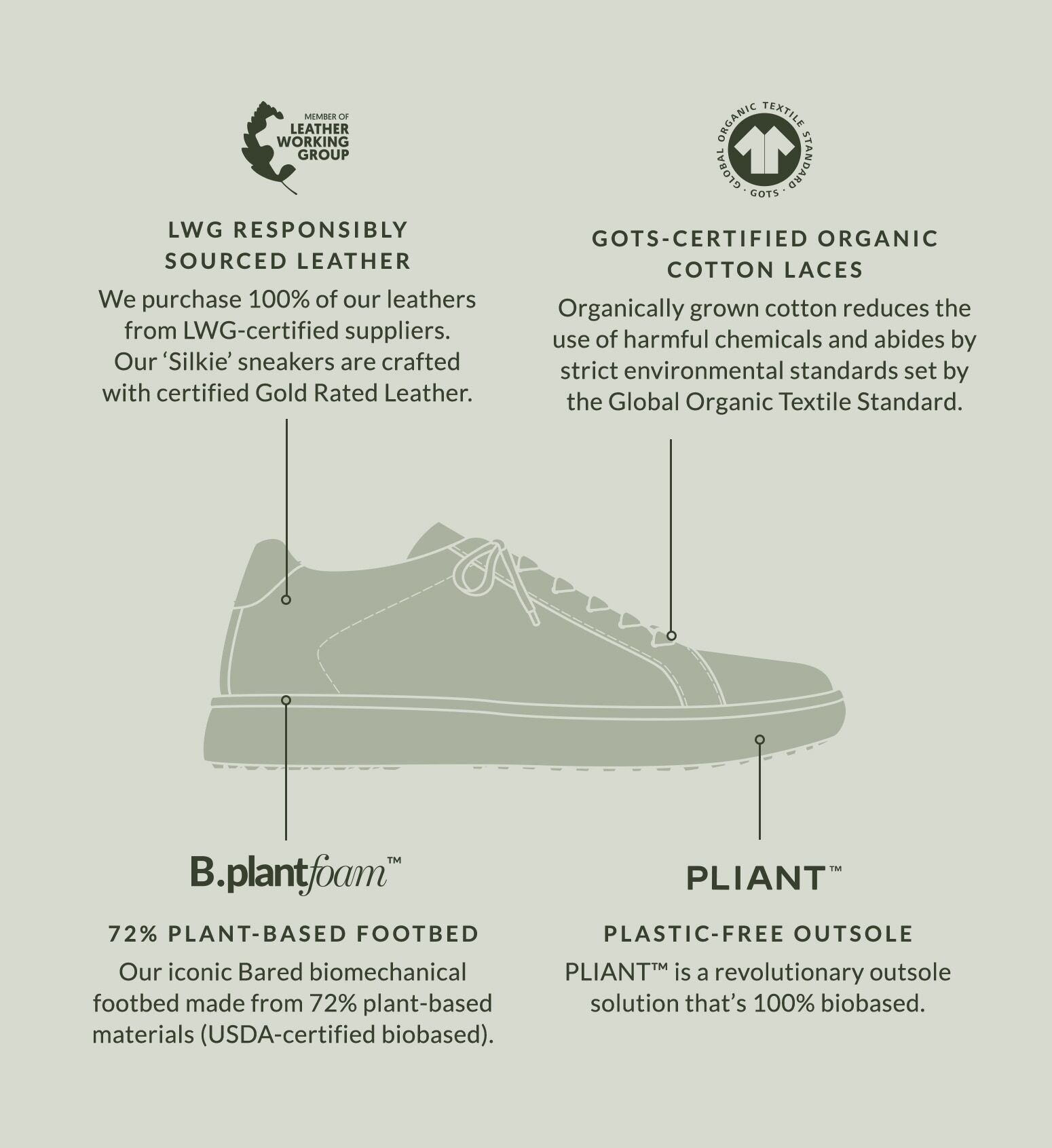 - Leather upper, PLIANT™ outsole, leather lining and a canvas-lined B.plantfoam™ footbed.