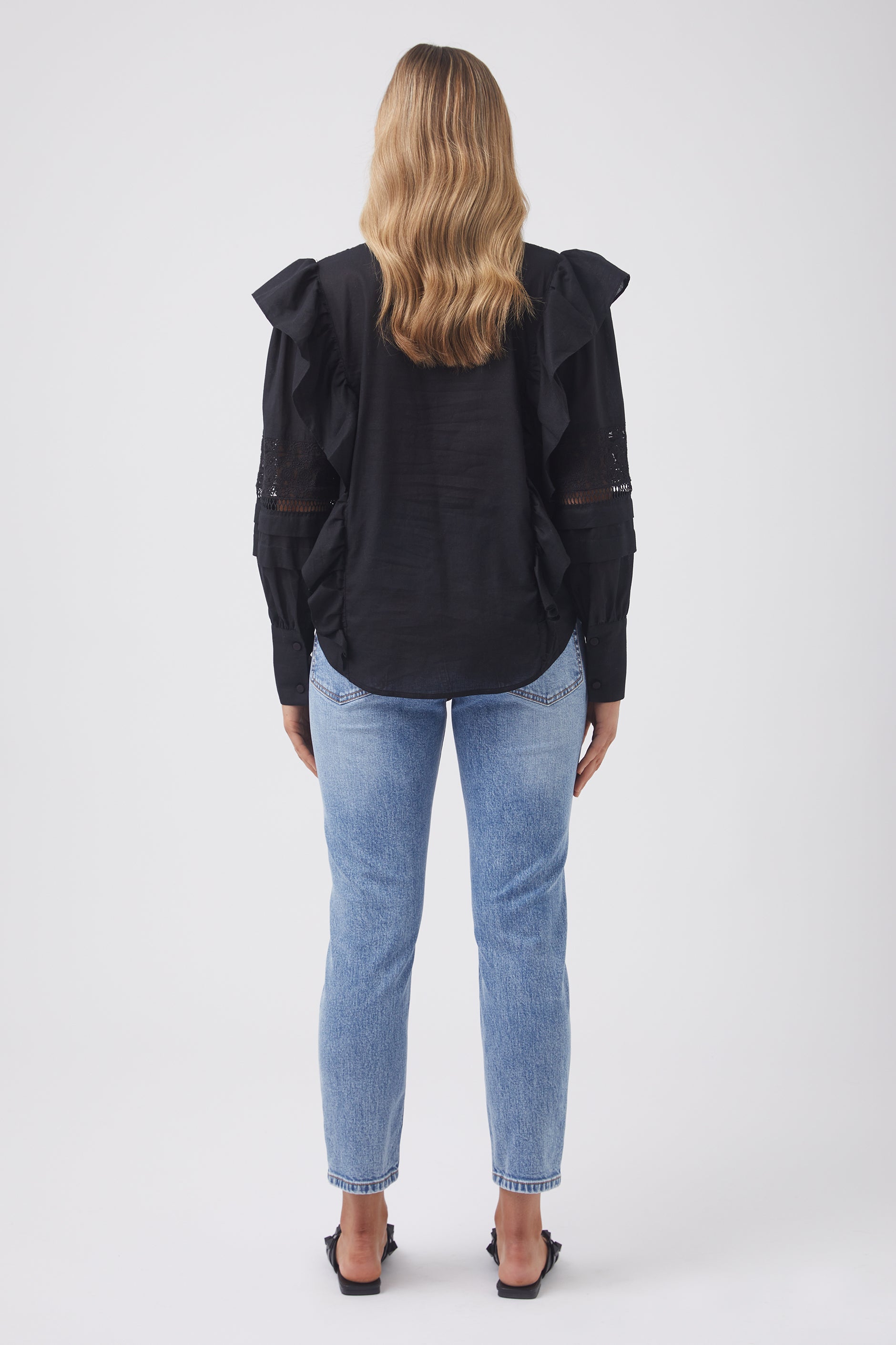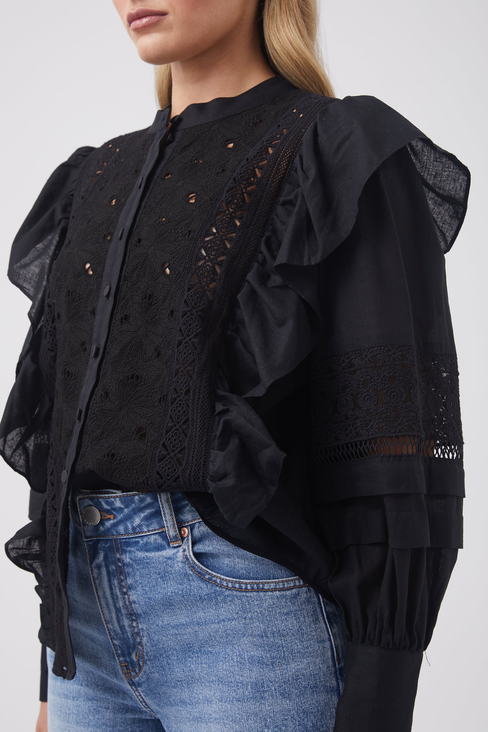 - Extended shoulder ruffle detail